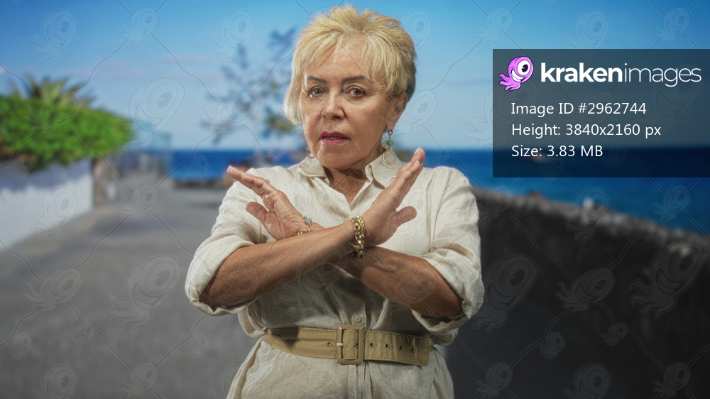 Woman with hands crossed in an x gesture, visible palms and forearms, standing on a seaside street promenade with stern expression; defiance refusal.
