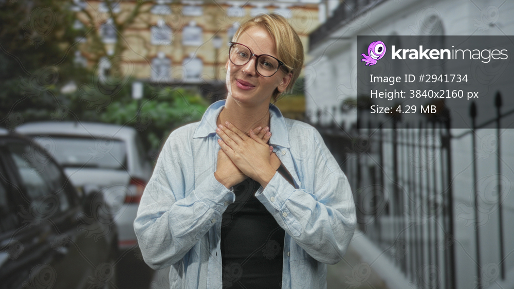 Woman with hands crossed on chest and eyes closed smiling on a city street lined with parked cars and iron railings; gratitude.