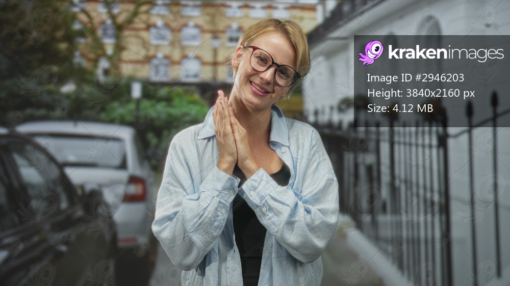 Woman with hands crossed on chest and eyes closed smiling on a city street lined with parked cars and iron railings; gratitude.