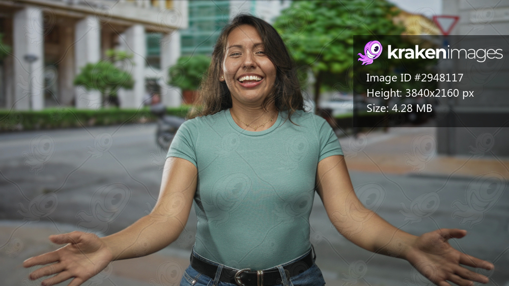 Woman with hands crossed over chest on street wearing teal tshirt and jeans, smiling at camera amid urban trees and building facades; gratitude self care. - Kraken Images