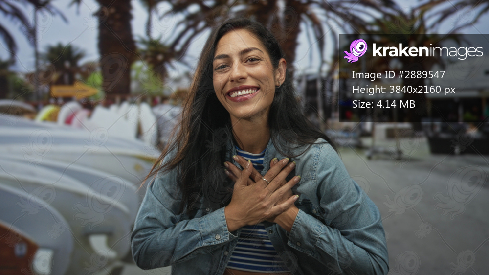 Woman with hands crossed over chest wearing denim jacket and striped crop top on street with surfboards and palm trees; gratitude connection.
