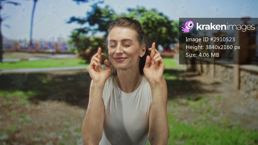 Woman with hands and fingers crossed, eyes closed and smiling in street park setting under green trees and sunlight; hopeful luck.