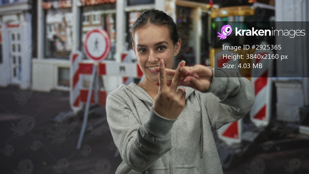 Woman with hands forming a hashtag gesture on a busy street near red white traffic bollards and pedestrian sign, smiling toward camera; playful confidence. - Kraken Images