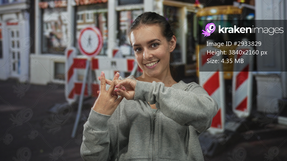 Woman with hands forming a hashtag gesture on a busy street near red white traffic bollards and pedestrian sign, smiling toward camera; playful confidence. - Kraken Images