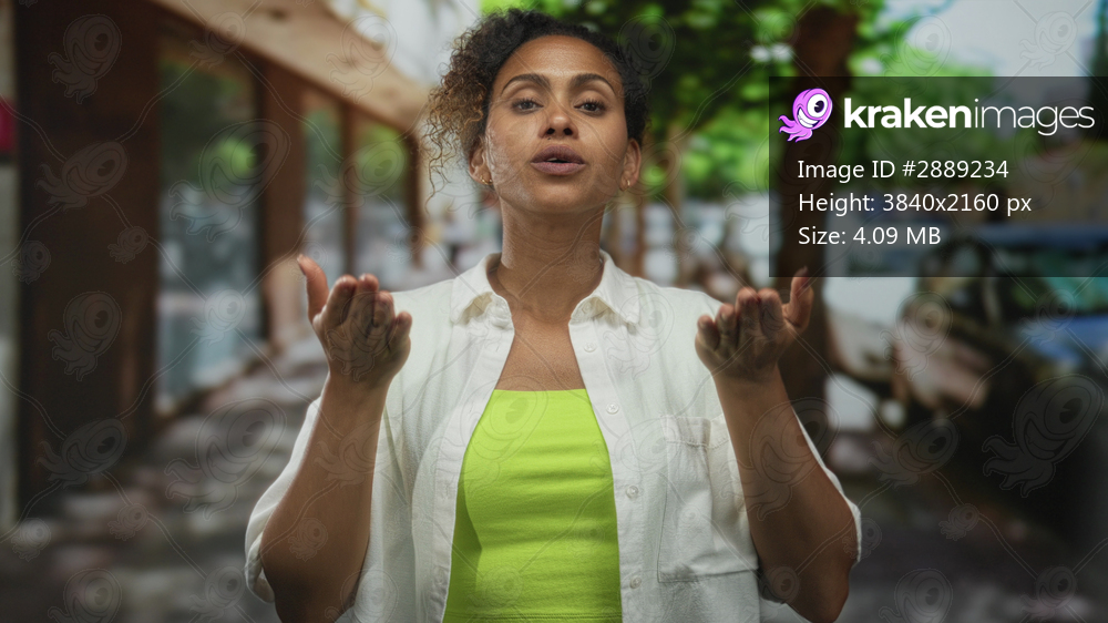 Woman with hands forming ok sign and closed eyes wearing lime green top and white shirt, standing on a tree lined city street near parked car; calm mindfulness. - Kraken Images