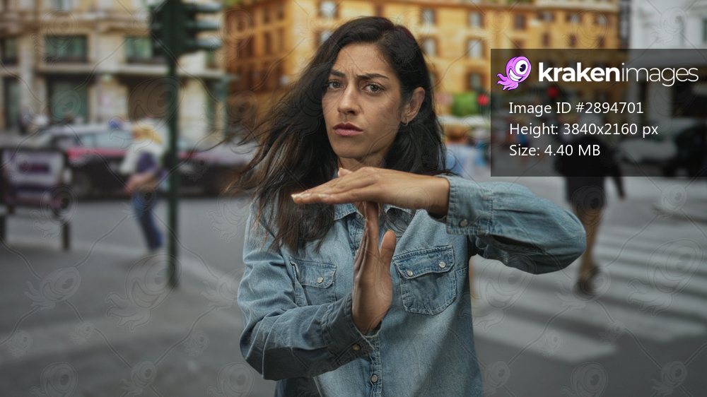 Woman with hands forming timeout gesture on a busy city street wearing blue denim shirt and windblown hair; defiance.