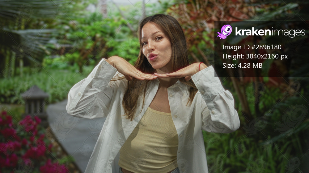 Woman with hands framing chin puckering lips on park path among green plants and flowers; playful charm.