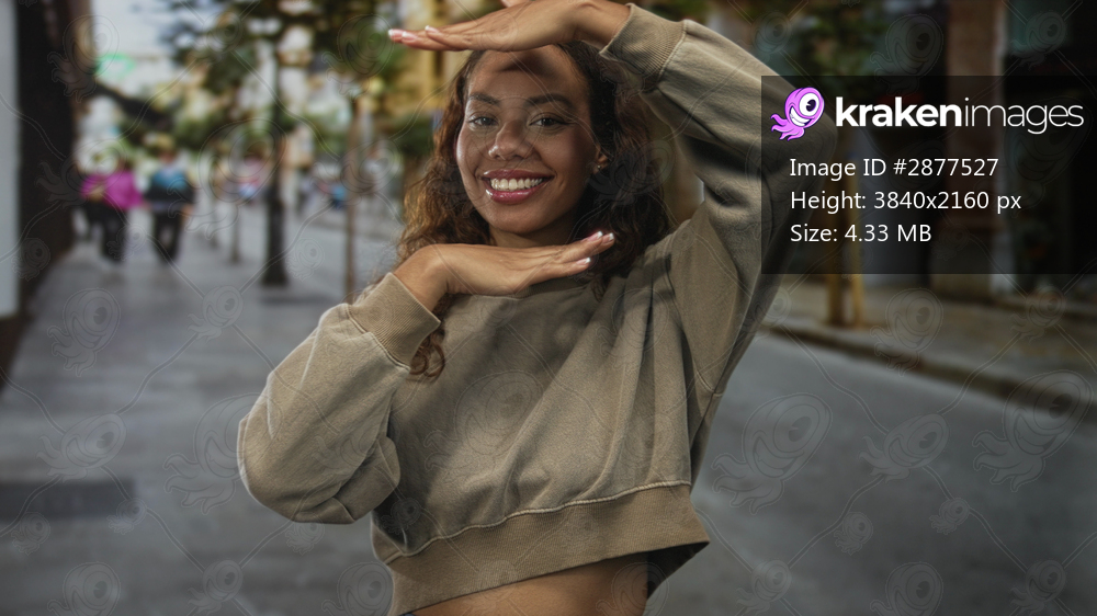 Woman with hands framing face on a busy city street smiling in a cropped sweater; joy playful confidence.