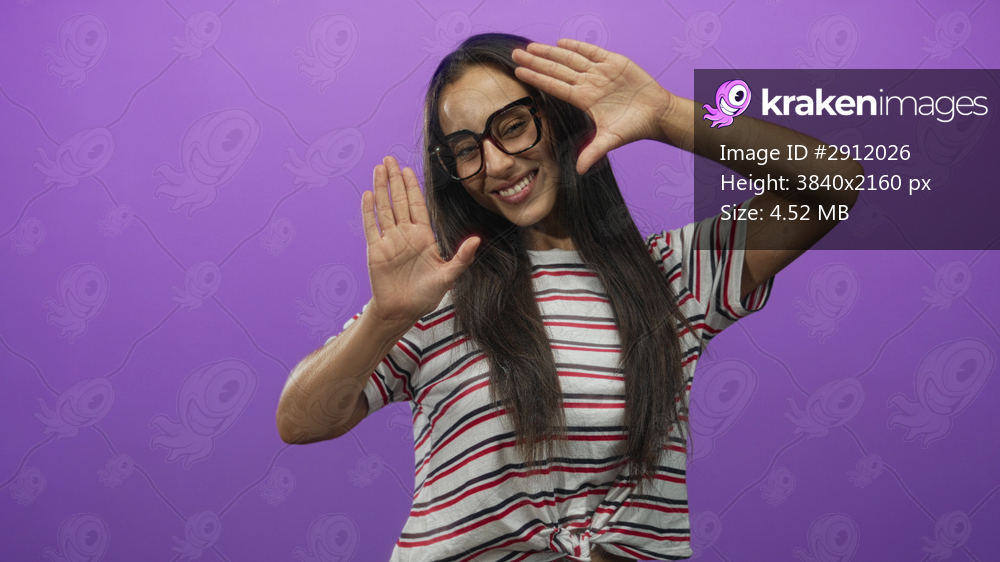 Woman with hands framing face smiling in purple studio wearing striped shirt and glasses; youthful joy.
