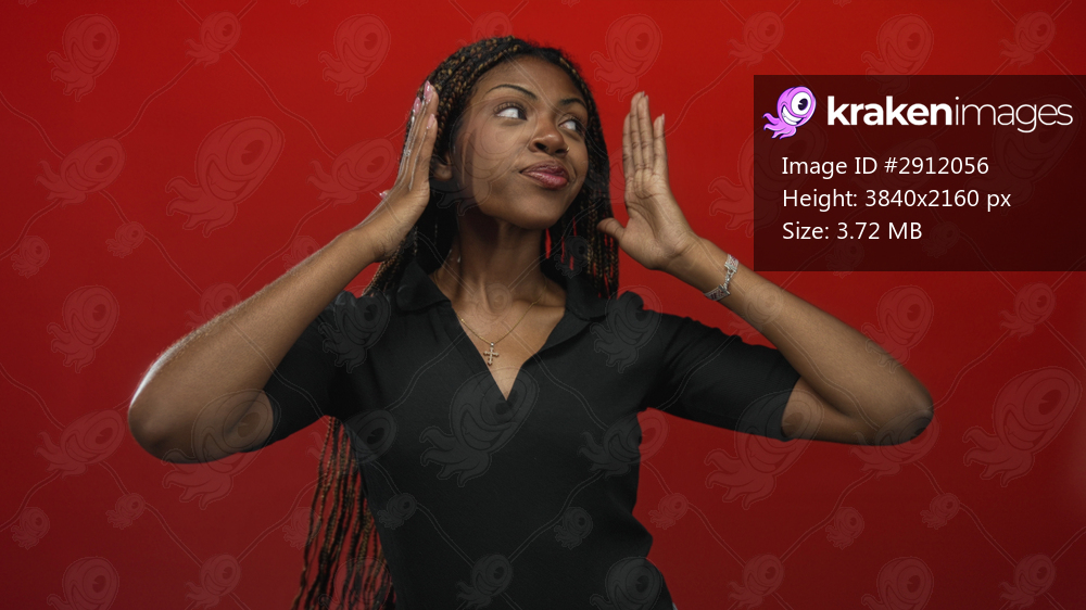 Woman with hands framing head and winking in red studio, wearing black top and cross necklace; playfulness.