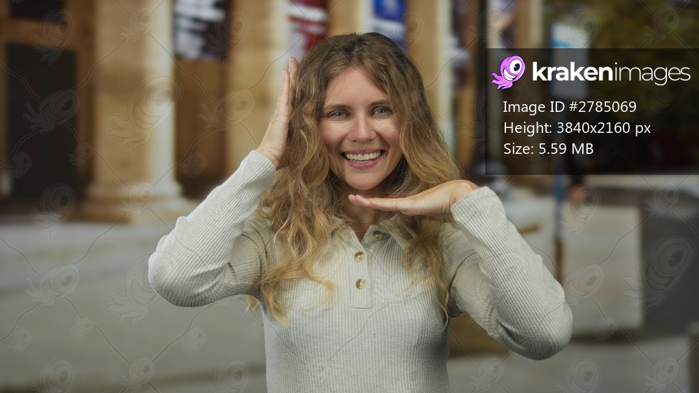 Woman hands framing street blonde young smile casual curly urban scene exudes playful energy.
