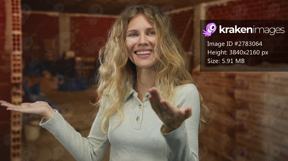 Woman with hands gesturing construction feedback alongside a blonde young model inside a warehouse smiling in a casual renovation environment.