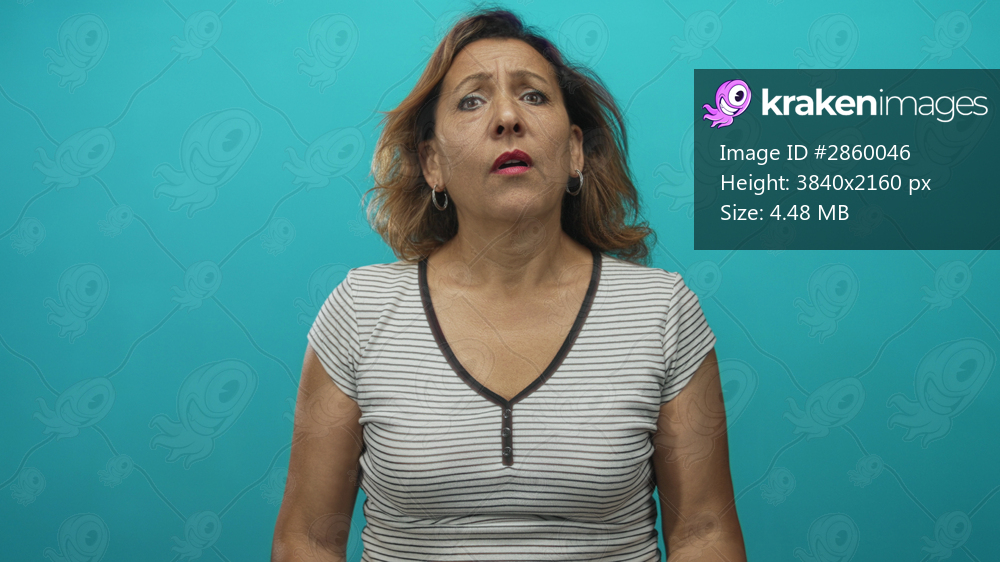 Woman with hands held out, palms up asking for money in a turquoise studio set; financial need pleading.