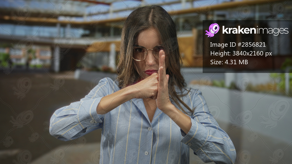 Woman with hands in a fighting gesture and intense stare outside a modern building atrium; defiance self defense.