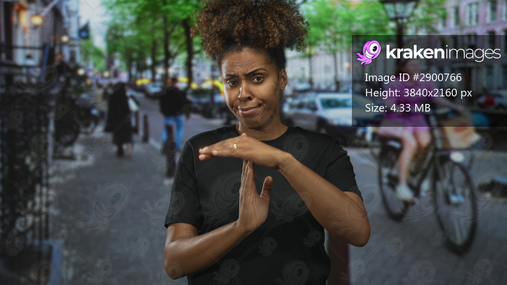 Woman with hands in t for timeout on city street, wearing black t shirt and looking skeptical while making a stop gesture; dismissal.