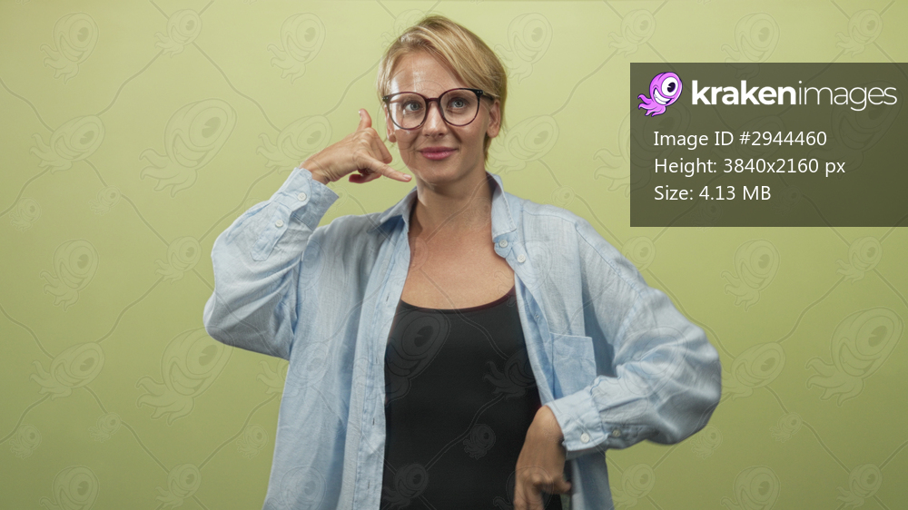 Woman with hands making finger counting and phone gesture, touching index and thumb, wearing glasses and light shirt in a studio; casual curiosity.