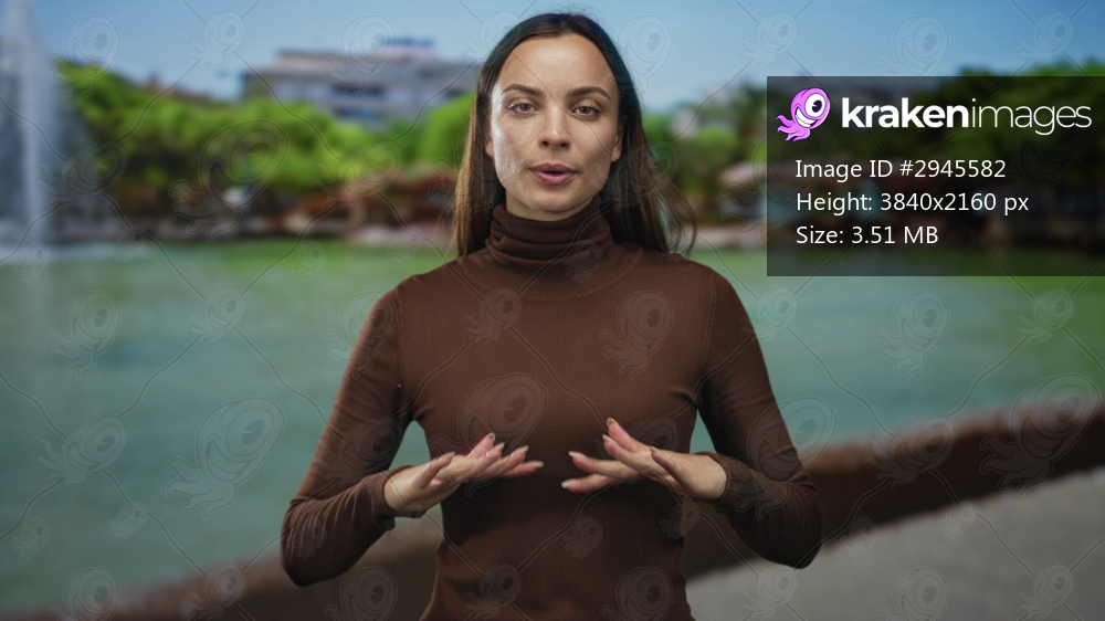 Woman with hands near chest and eyes closed at a park pond by a building fountain, gentle breathing and hand gesture; calm mindfulness.
