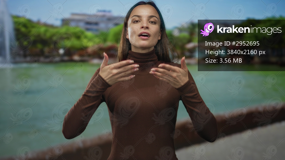 Woman with hands near chest and eyes closed at a park pond by a building fountain, gentle breathing and hand gesture; calm mindfulness.