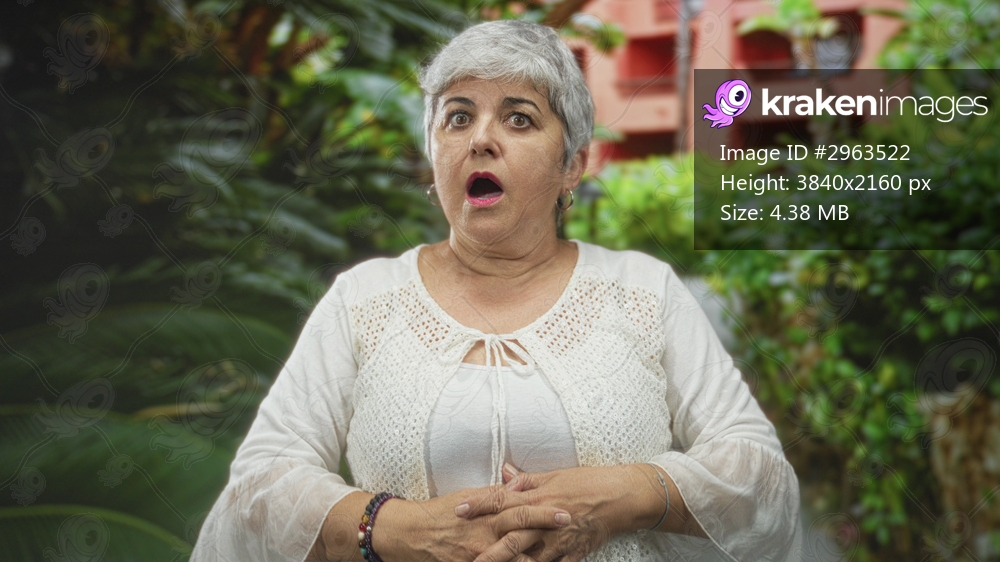 Woman with hands near chest and mouth open touching forehead in front of a building and garden, showing varied surprised gestures; surprise reflection. - Kraken Images