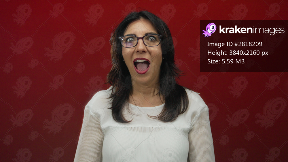 Woman with hands on cheeks and excited open mouth in red studio, wearing glasses and white blouse; surprise.