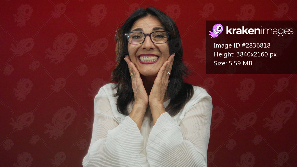 Woman with hands on cheeks and excited open mouth in red studio, wearing glasses and white blouse; surprise.