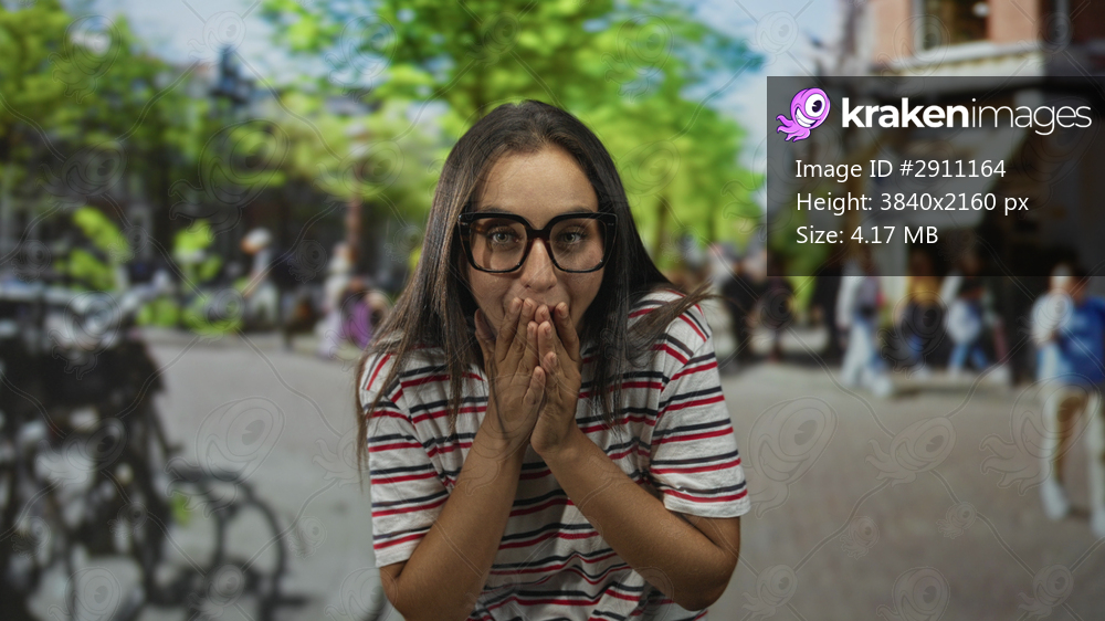 Woman with hands on cheeks and glasses on a sunny city street, striped shirt visible; surprise wonder.