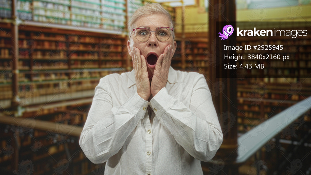 Woman with hands on cheeks and mouth open among tall bookshelves in library; astonishment discovery.