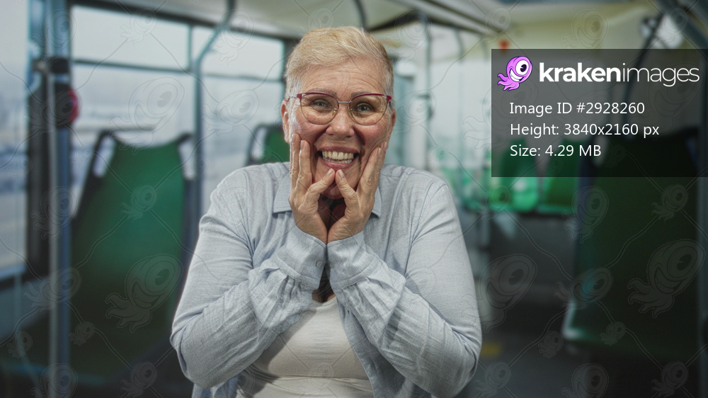 Woman with hands on cheeks and puckered lips seated on green bus seats inside a bus with windows and handrails on a street; surprise.