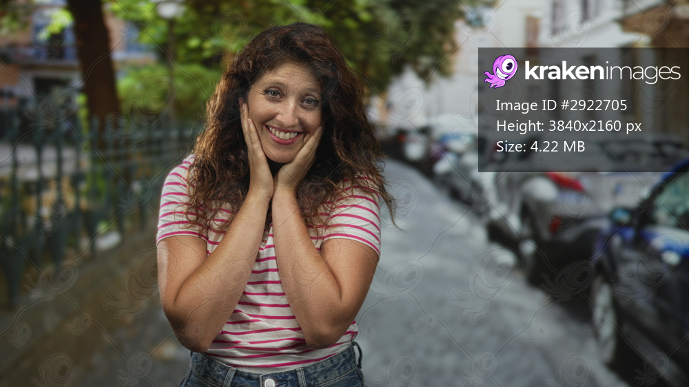 Woman with hands on cheeks smiling on cobblestone street by parked cars and green fence, wearing striped shirt and denim waist; joy hope.