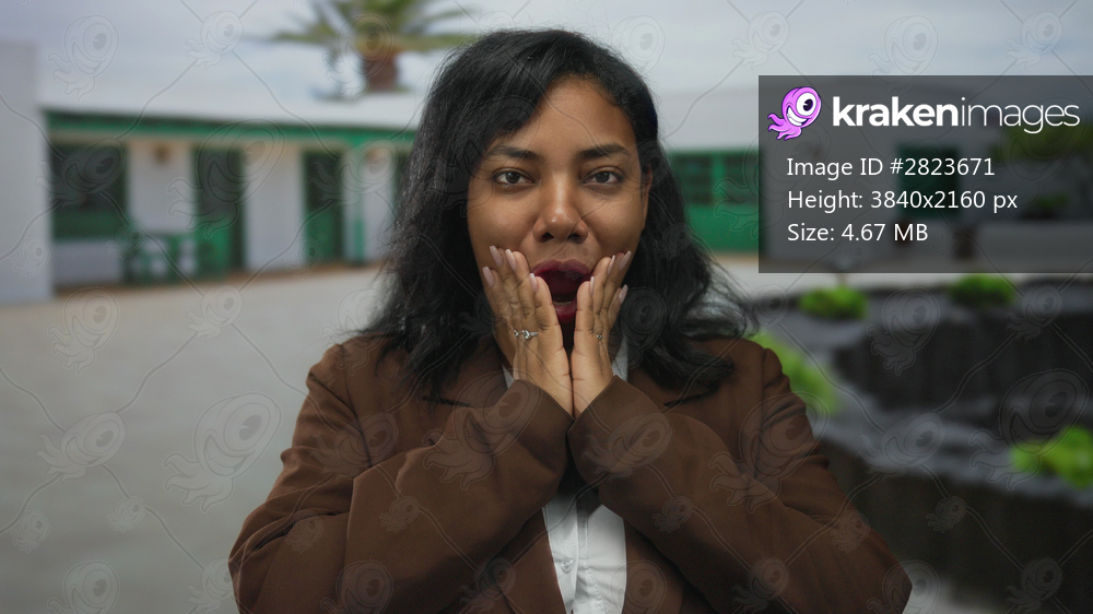 Woman with hands on cheeks wearing a brown blazer stands outdoors in front of a white building; surprise.