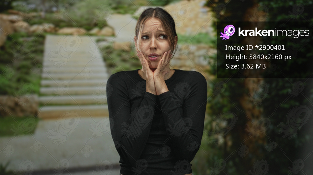 Woman with hands on cheeks and worried expression in front of outdoor stone steps on street; anxiety uncertainty.