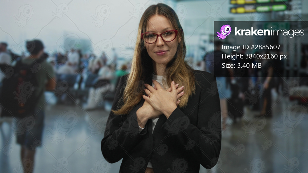 Woman with hands on chest at airport terminal wearing red glasses and black blazer, eyes closed in a gentle grateful pose among travelers; gratitude reflection. - Kraken Images
