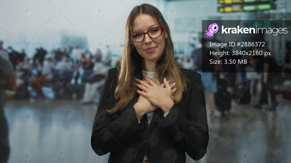 Woman with hands on chest at airport terminal wearing red glasses and black blazer, eyes closed in a gentle grateful pose among travelers; gratitude reflection. - Kraken Images