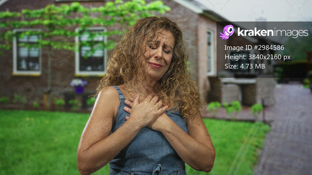 Woman with hands on chest in front of building, eyes closed and slight smile showing a relieved gesture; relief healing.