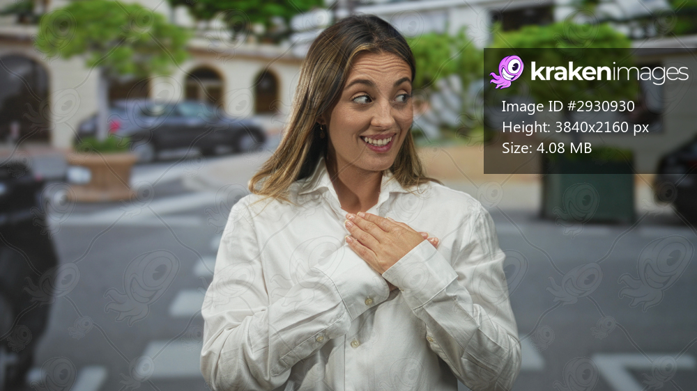 Woman with hands on chest on a street crosswalk, smiling and looking down in white shirt; gratitude.