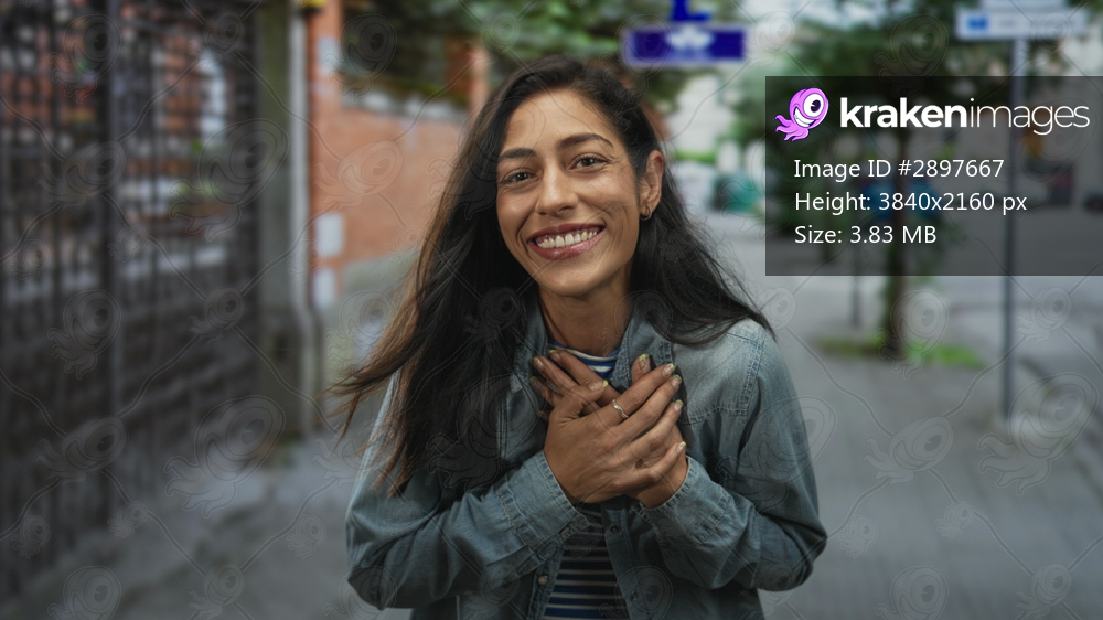 Woman with hands on chest on street smiling warmly at camera while wearing denim jacket and striped top; gratitude warmth sincerity.