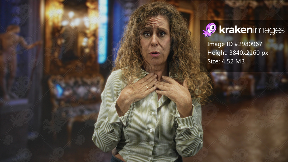 Woman with hands on chest pleading, striped shirt and visible rings, in an ornate museum building; sorrow confession.