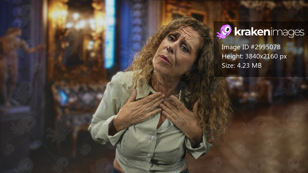Woman with hands on chest pleading, striped shirt and visible rings, in an ornate museum building; sorrow confession.