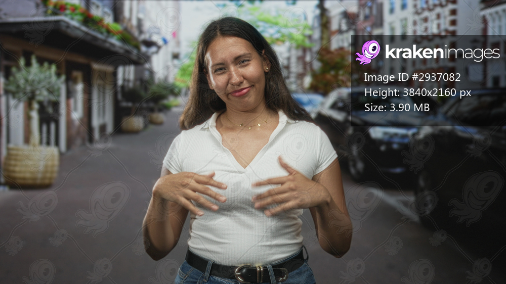 Woman hands on chest with slight smile and closed eyes on street in city wearing white top and jeans belt visible; embarrassment selfawareness.