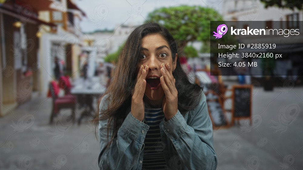 Woman with hands on chest smiling with open mouth in a restaurant terrace on a street outdoors; joy gratitude.