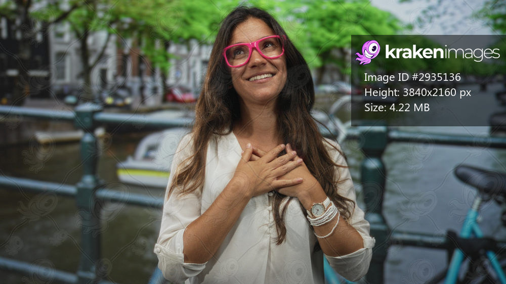 Woman with hands on chest wearing pink glasses and white blouse on canal bridge street with bicycle; gratitude warmth connection.