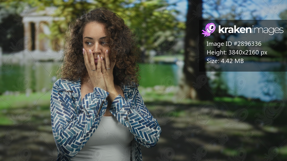 Woman with hands on face in park by a lake, holding palms to cheeks and covering mouth while standing outdoors; quiet concern.