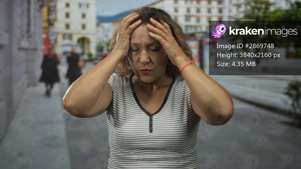 Woman with hands on forehead with closed eyes and strained brow on busy city street between buildings; stress.