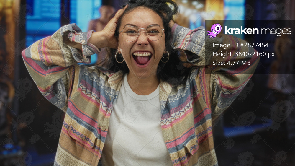 Woman hands on head laughing with mouth open in museum building, wearing glasses, hoop earrings and patterned shirt; joy discovery.