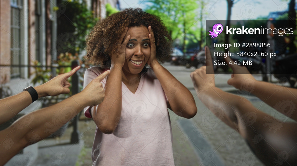 Woman with hands on head and multiple fingers pointing at her on a busy city street with parked cars; isolation anxiety.