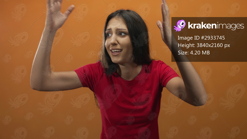Woman with hands on head and open mouth in orange studio wearing red shirt showing stressed expression; frustration tension.