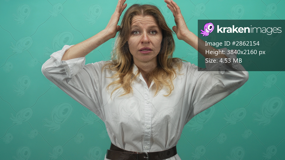 Woman with hands on head and raised arms in studio teal backdrop wearing white shirt and belt, waist up; anxiety exhaustion.