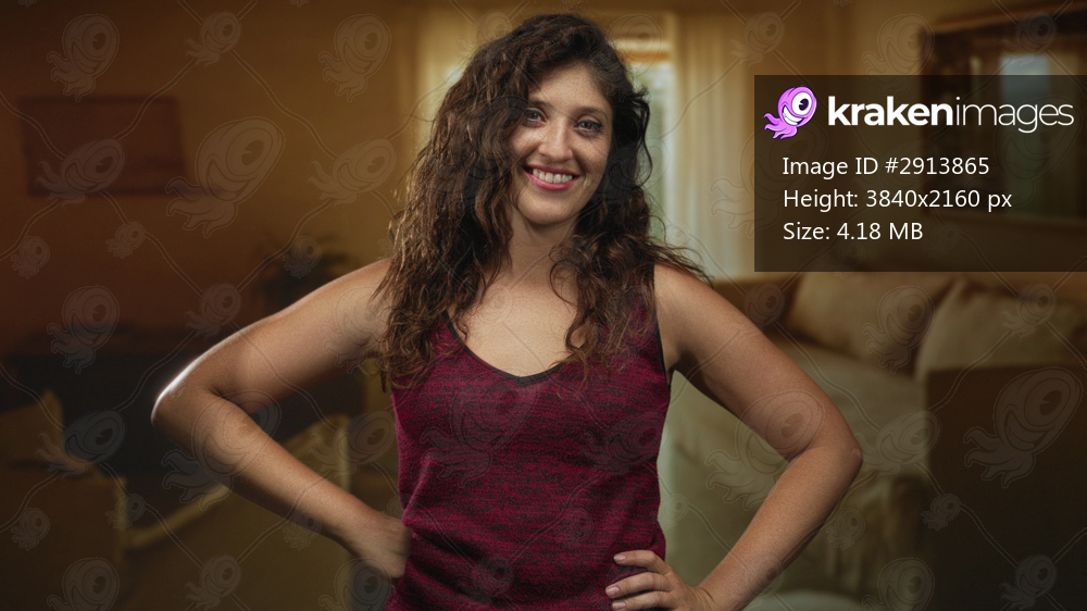 Woman with hands on hips and bare arms visible in a living room inside a building, smiling at camera; confidence comfort.