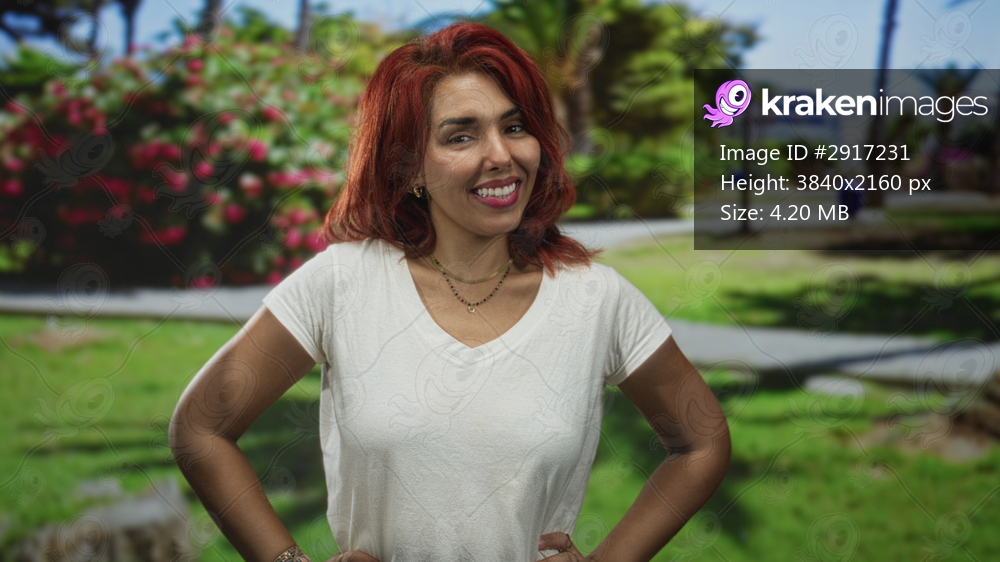 Woman with hands on hips in park, smiling at camera, wearing white t shirt and gold necklaces, red hair visible; confidence leisure.