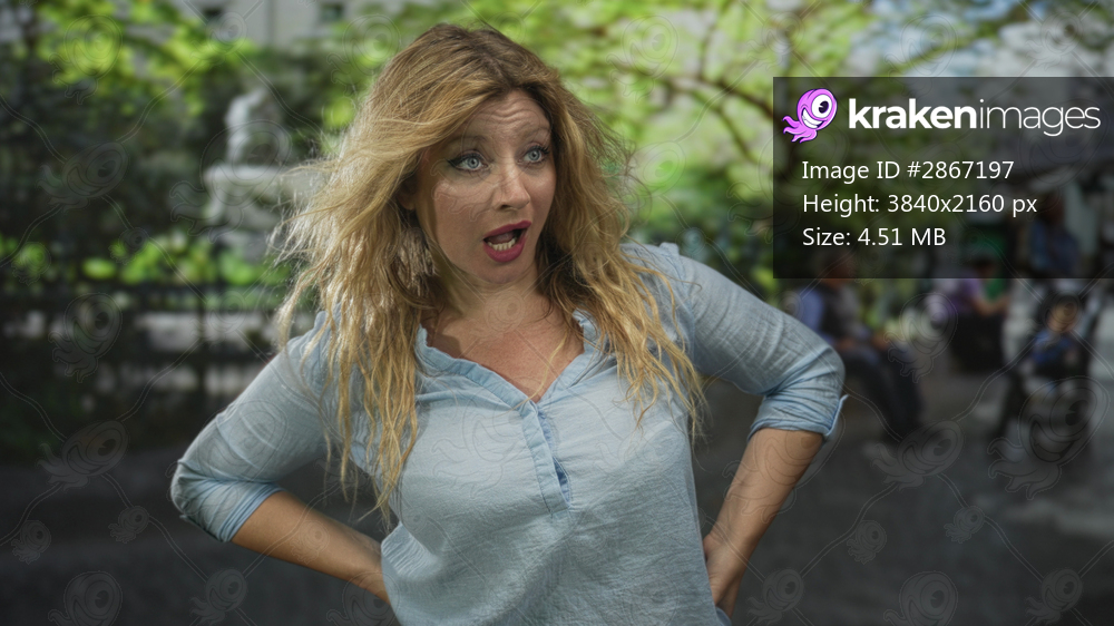 Woman with hands on hips on a street near a fountain, loose blonde hair and open mouth mid gesture; frustration candid moment.